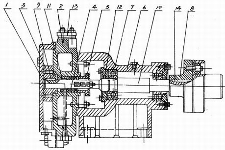 8. 聯軸器 9.葉輪平健(jian) 10.泵軸 11.填料環 12.軸承(cheng)壓蓋 13.法蘭盤 14.聯軸(zhou)器平健