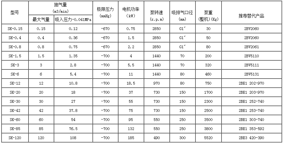 SK系列水環式(shì)真空泵及壓縮機(ji)是用來抽吸或壓(yā)送☎️氣體和其它無(wú)腐蝕性、不溶于水(shuǐ)、不含有固體顆粒(lì)的氣體,以便在密(mì)閉容器中形成真(zhen)空或壓力,滿足工(gong)藝流程要求。吸入(ru)或📐壓送的🙇♀️氣體中(zhong)允許混有少量的(de)液體。
