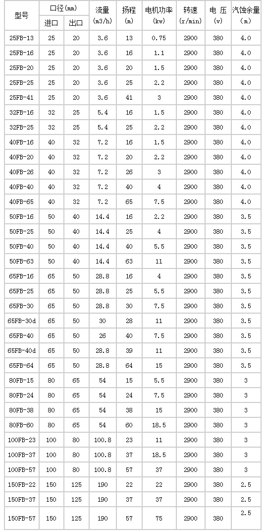 三(sān)、技術參數: FB、AFB型耐腐(fu)蝕離心化工泵